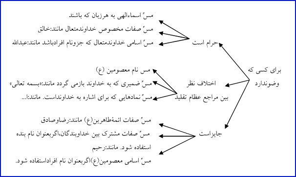 6) مطابق نظر بـرخی از مـراجع عظام[9] مسِّ ضمیرهایی که به ذات بـاری تعالـی بر میگردند مثـل