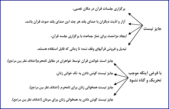 4. خواندن قرآن با صدای بلند در مکانهای عمومی و در صورتی که موجب آزار و اذیت دیگران شود جایز نیست[4].